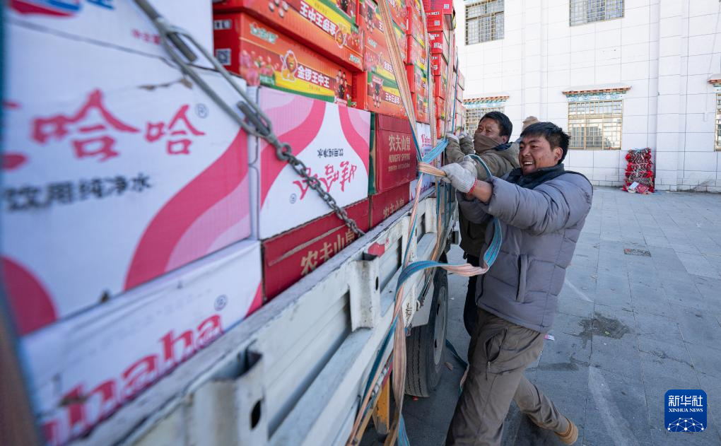 在定日县洛谐广场,工作人员用绳子固定已装车的抗震救灾物资(1月15日摄)。