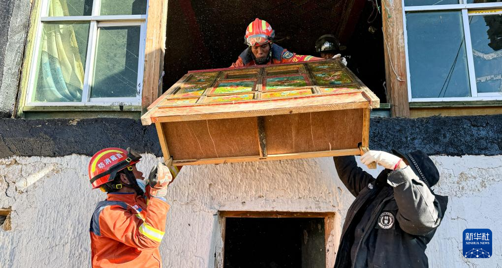 在定日县曲洛乡仁果村,救援人员帮助村民搬运家具(1月15日摄)。