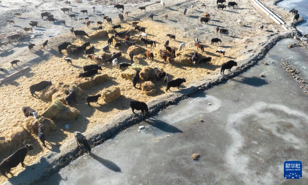 在定日县长所乡嘎布村,牛在吃草料(1月15日摄,无人机照片)。