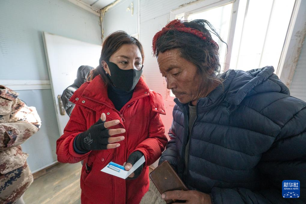 在定日县长所乡森嘎村,电信工作人员为受灾群众发放电话卡(1月14日摄)。