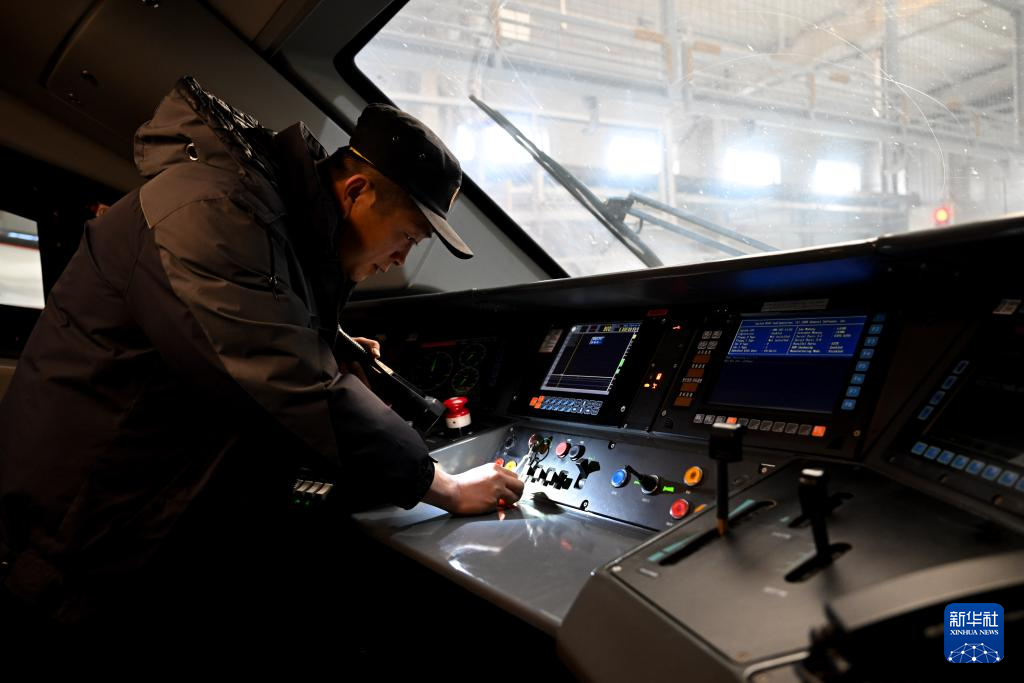 1月16日,中国铁路青藏集团有限公司西宁车辆段动车运用车间工作人员贾成鹏在检查司机室操作台。