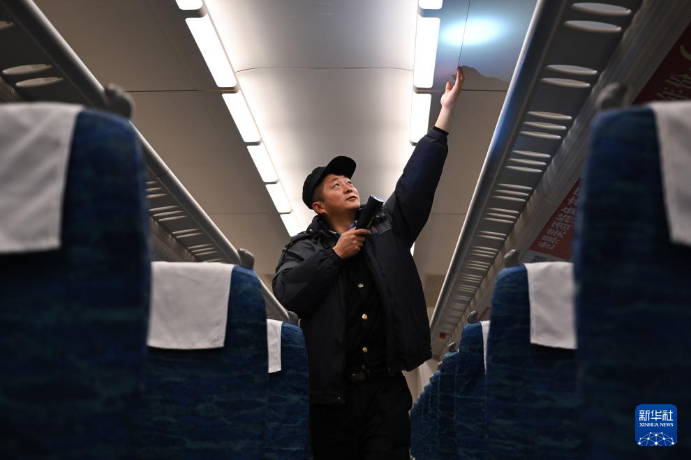 1月16日,中国铁路青藏集团有限公司西宁车辆段动车运用车间工作人员贾成鹏在检查客室。