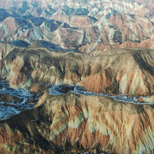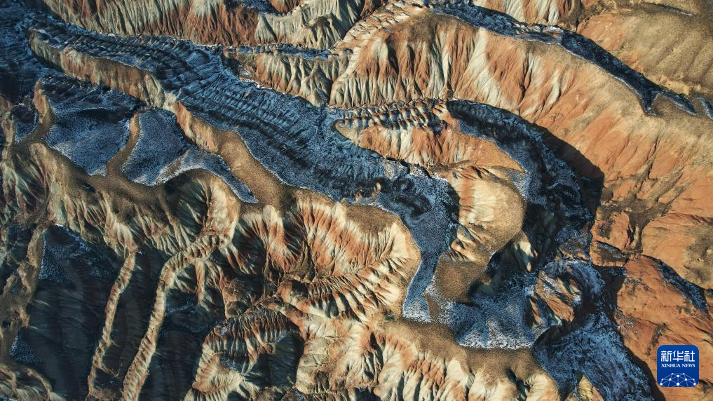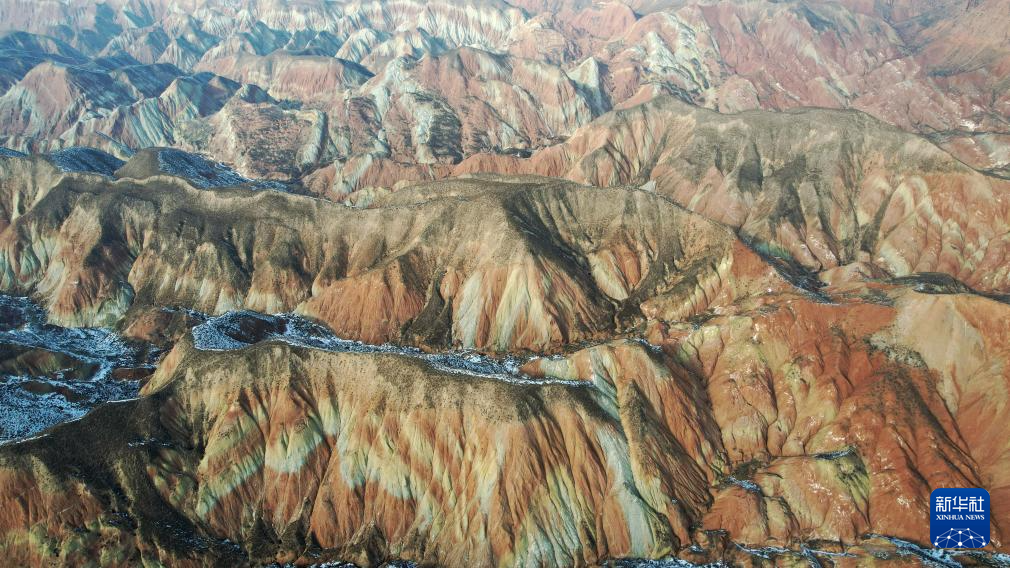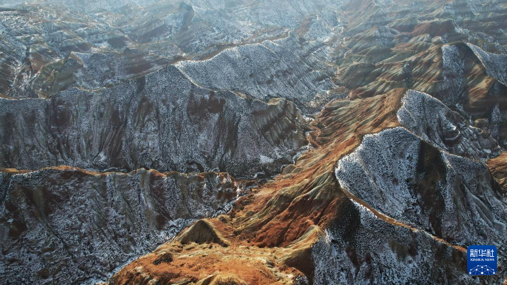 冬日,在甘肃省兰州市永登县树屏镇的兰州水墨丹霞景区,起伏绵延的山体在白雪的映衬下层理交错,更显瑰丽多姿。