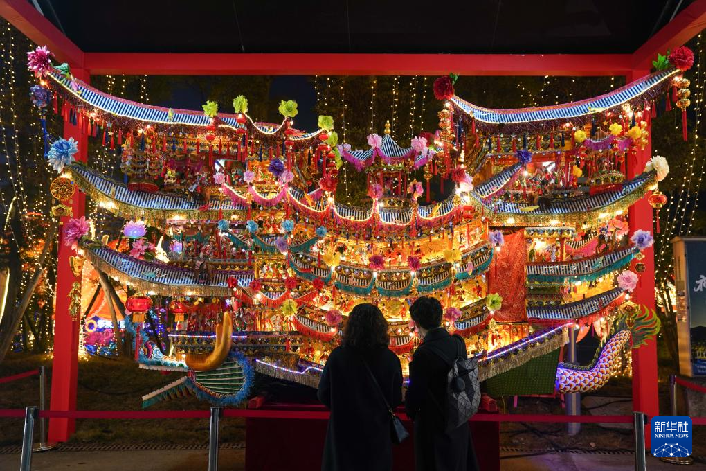 1月17日,游客在四川省自贡市中华彩灯大世界全国灯会灯彩非遗项目展上参观来自浙江省的“乐清首饰龙”彩灯。