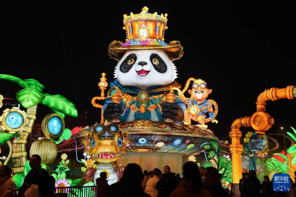 这是1月17日在四川省自贡市中华彩灯大世界拍摄的以大熊猫和金丝猴为原型创作的彩灯“朋克双宝”。