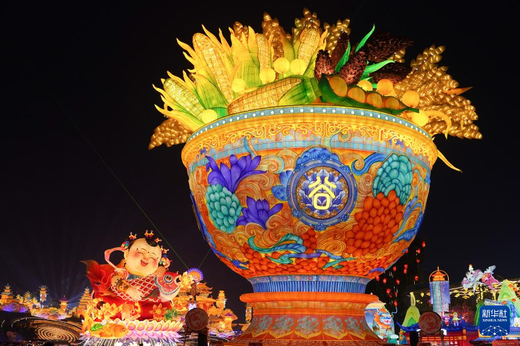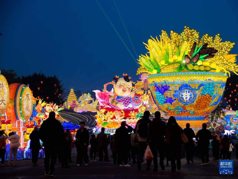 这是1月17日在四川省自贡市中华彩灯大世界拍摄的“五谷丰登”彩灯(前)和“年娃贺岁”彩灯(左后)。