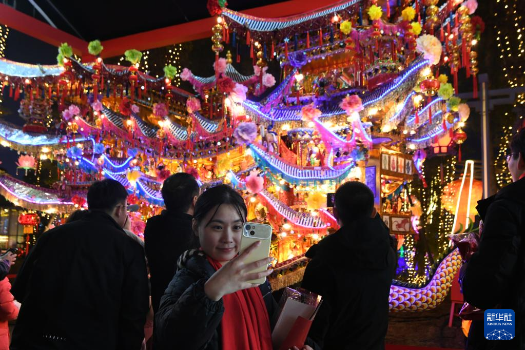 1月17日,游客在四川省自贡市中华彩灯大世界“乐清首饰龙”彩灯前拍照游览。