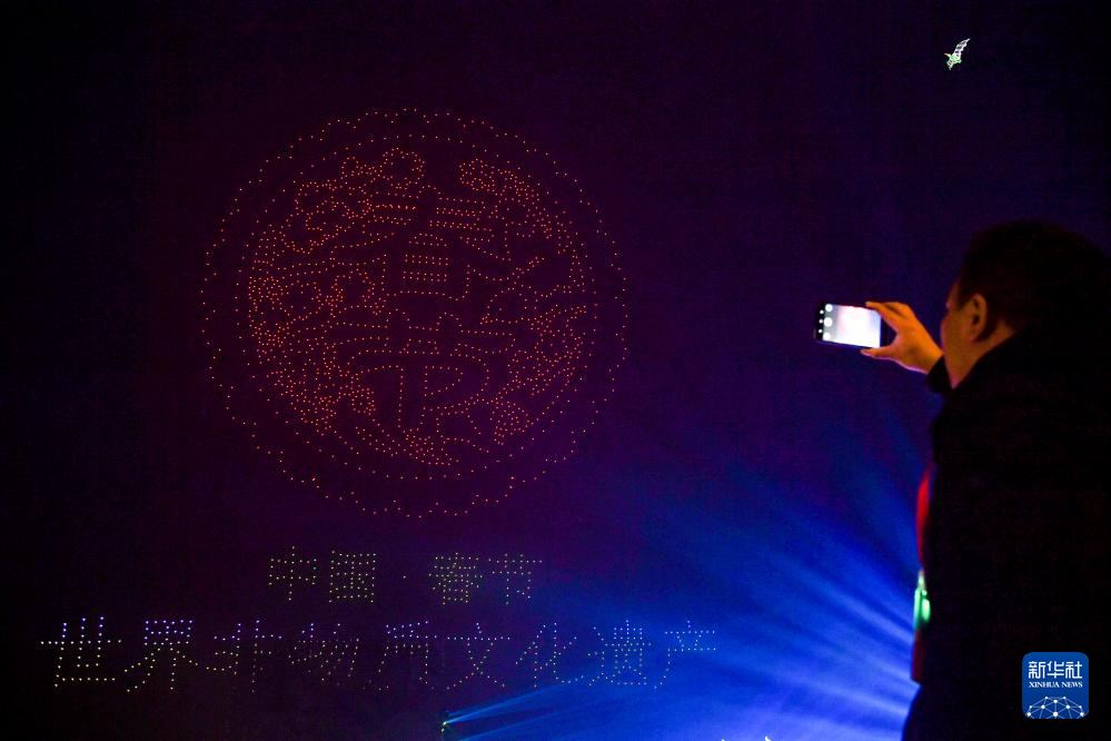 这是1月17日在四川省自贡市中华彩灯大世界拍摄的无人机表演。