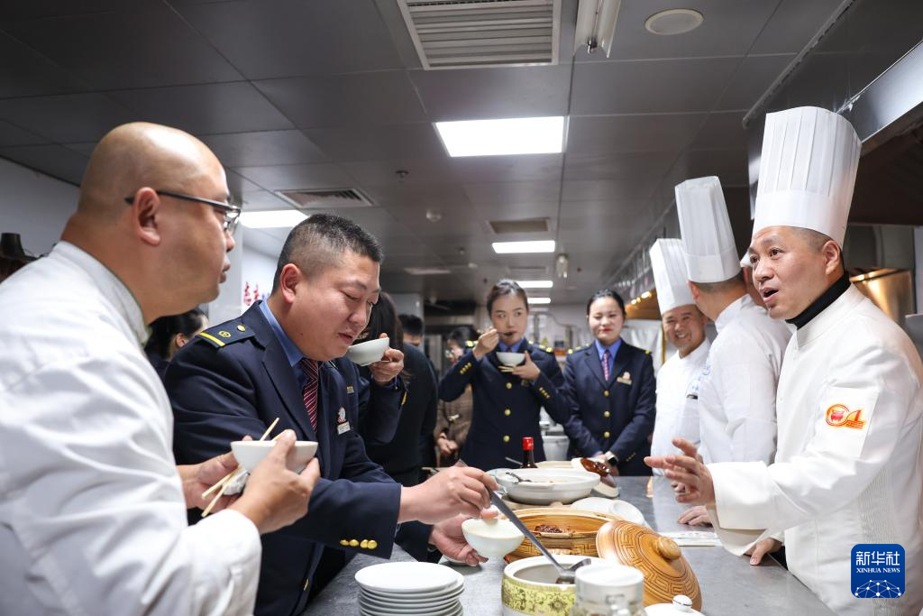 2024年12月29日,铁路杭州客运段餐车炊事员(左一)在杭州望湖宾馆与宾馆厨师团队交流菜品制作技艺。