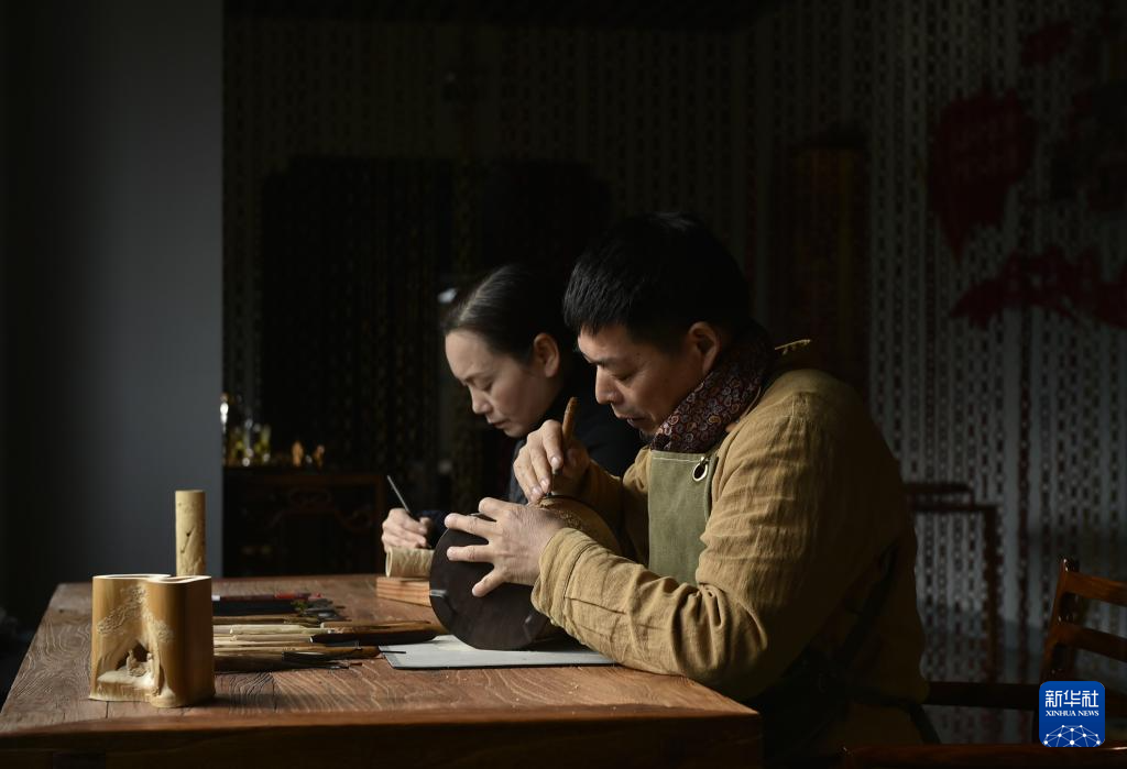 1月7日,在位于安徽省黄山市徽州区的徽州雕刻博物馆,洪建华(右)和妻子张红云在进行竹雕创作。