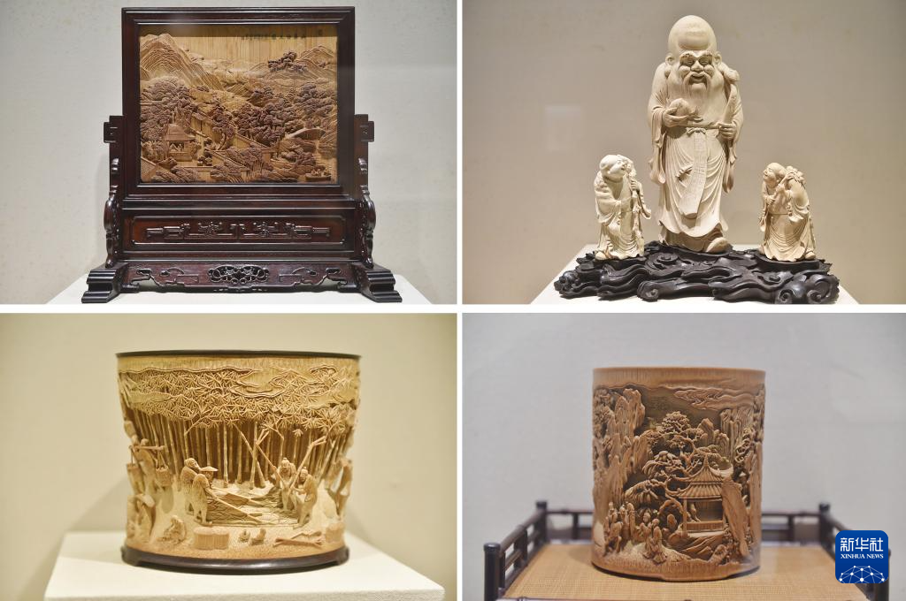 这是1月7日在徽州雕刻博物馆拍摄的洪建华创作的竹雕作品(拼版照片)。