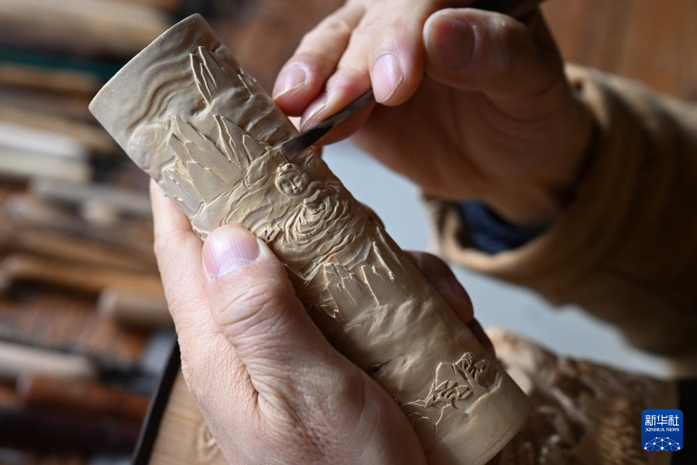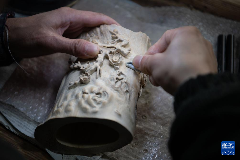 1月7日,在位于安徽省黄山市徽州区的徽州雕刻博物馆,洪建华的徒弟在进行竹雕创作。