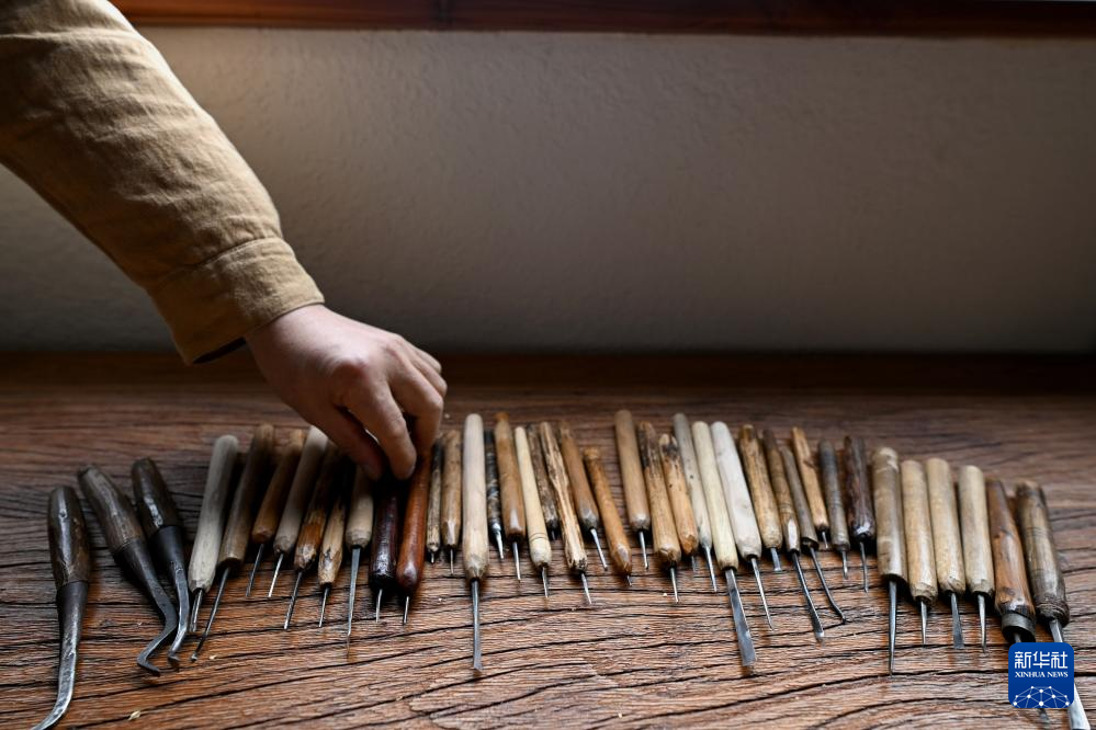 1月7日,在位于安徽省黄山市徽州区的徽州雕刻博物馆,洪建华展示竹雕创作使用的部分工具。