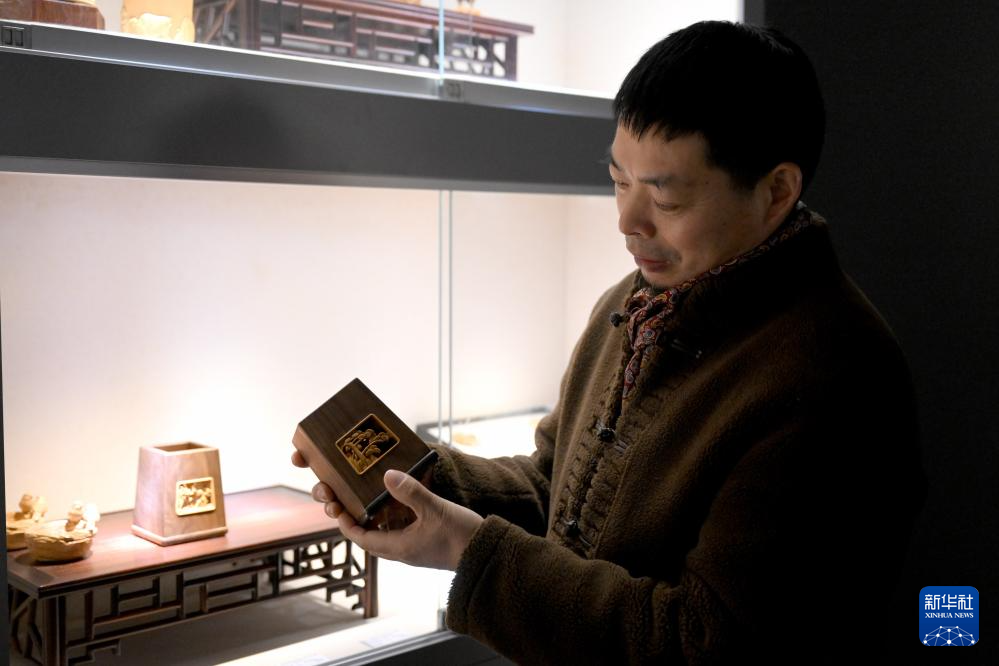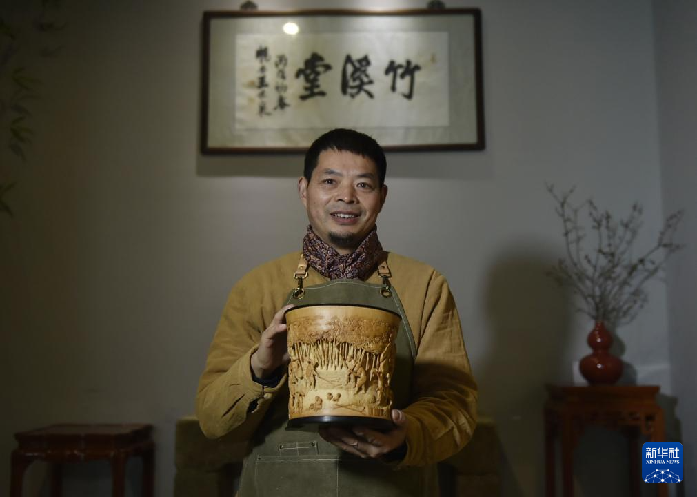 1月7日,在位于安徽省黄山市徽州区的徽州雕刻博物馆,洪建华展示自己创作的竹雕作品。