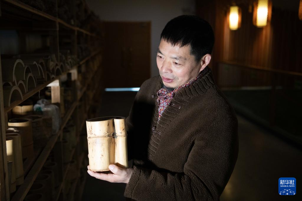 1月7日,在位于安徽省黄山市徽州区的徽州雕刻博物馆,洪建华在展示竹雕创作所需的原料。