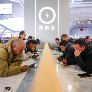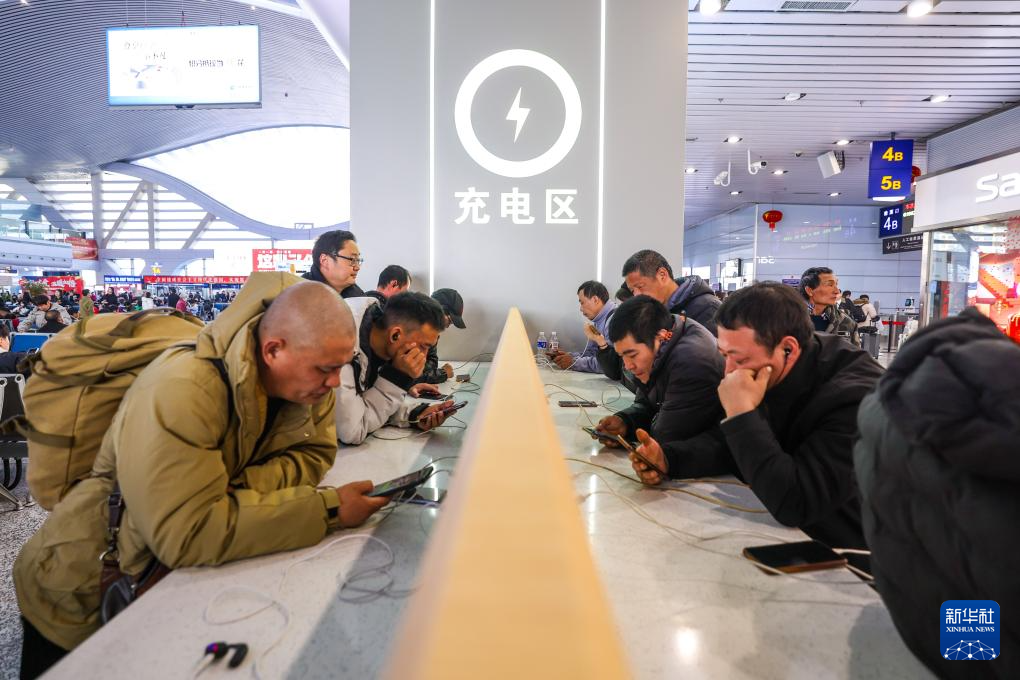 1月17日,乘客在宁波火车站内新设立的免费充电区域给手机充电。