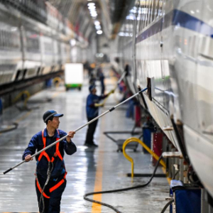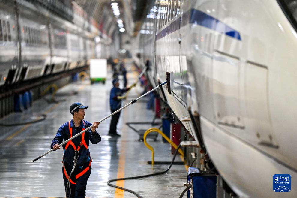 1月17日,工作人员对动车组车体表面进行清洁。