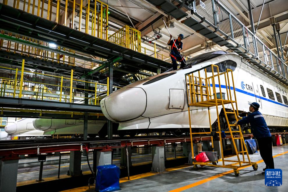 1月17日,工作人员对动车组车身两侧进行检查。