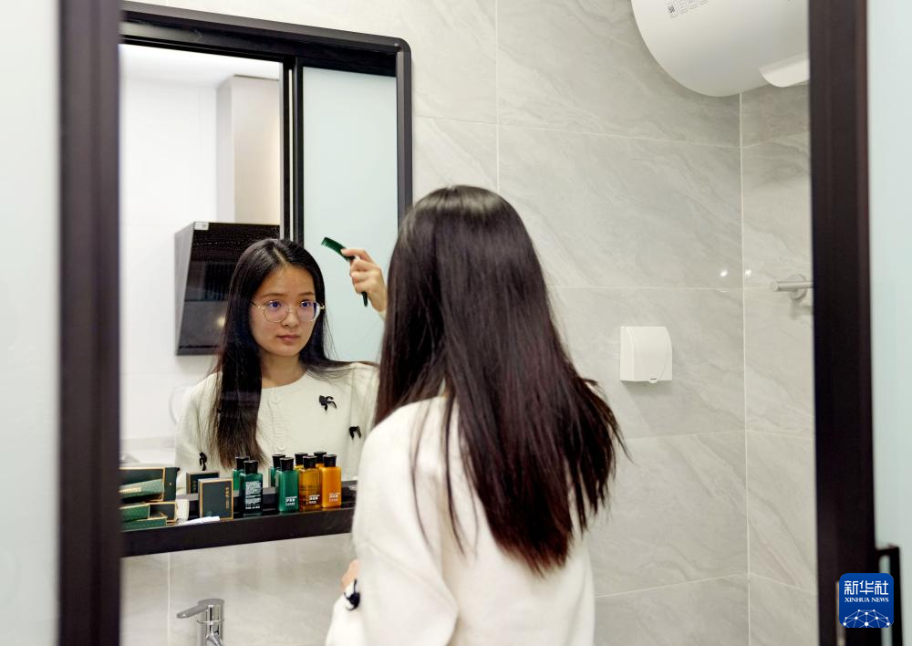 在虹桥人才公寓的“青春驿站”,入住青年程华倩在梳头(1月17日摄)。