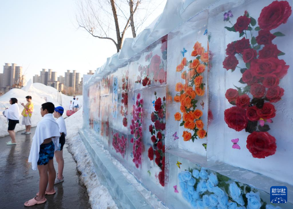 1月17日,在沈阳的清河半岛温泉度假酒店,游客在冰花墙前留影。