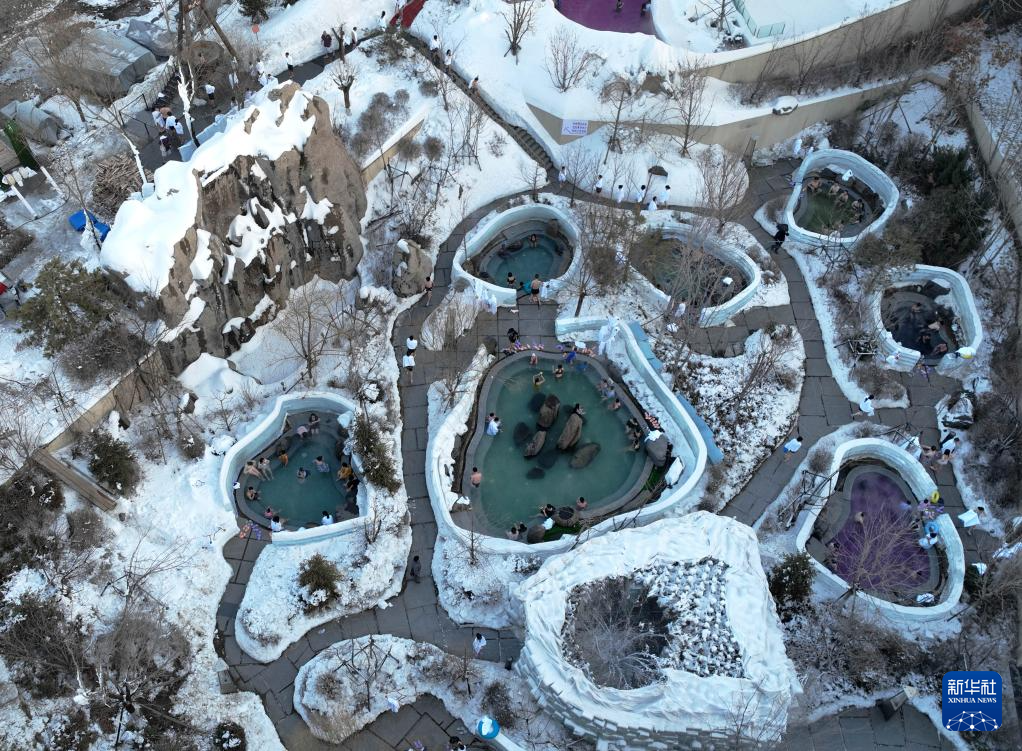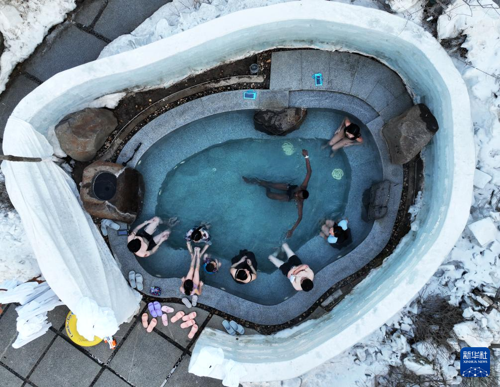 1月17日,在沈阳的清河半岛温泉度假酒店,游客体验冰雪温泉(无人机照片)。