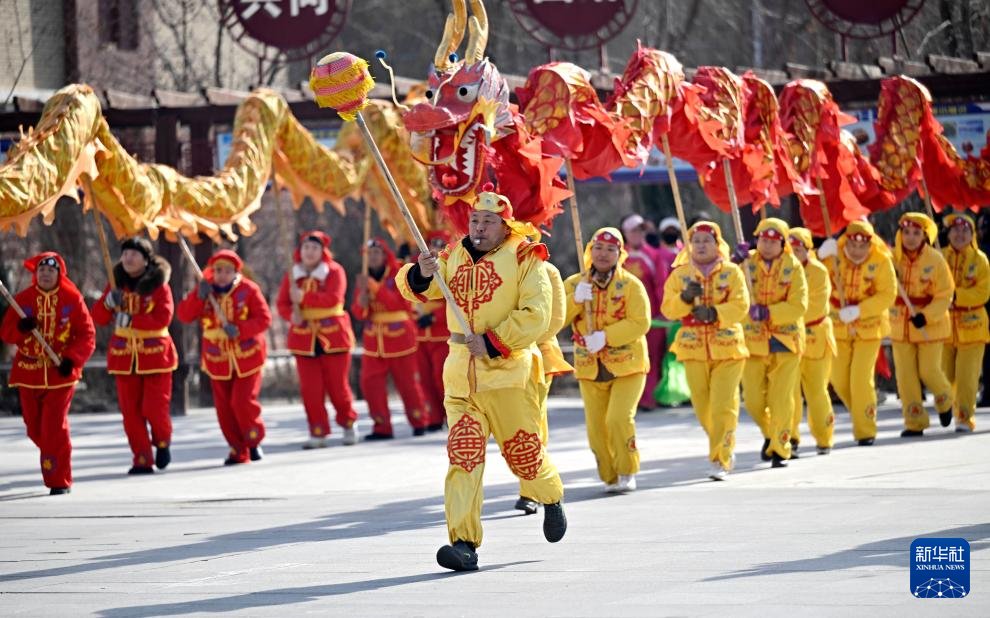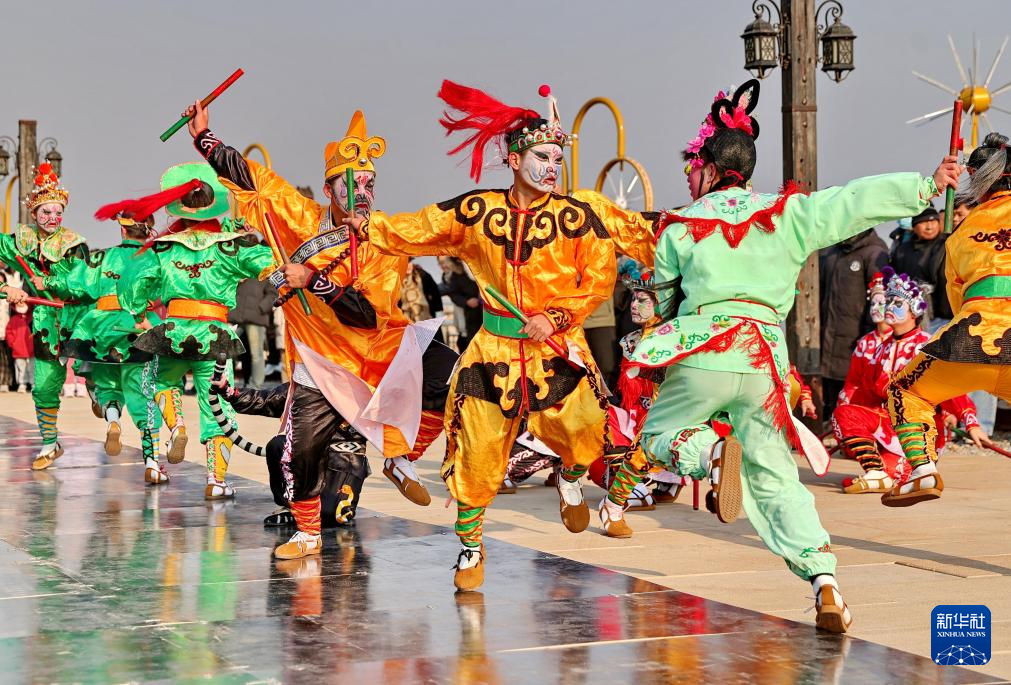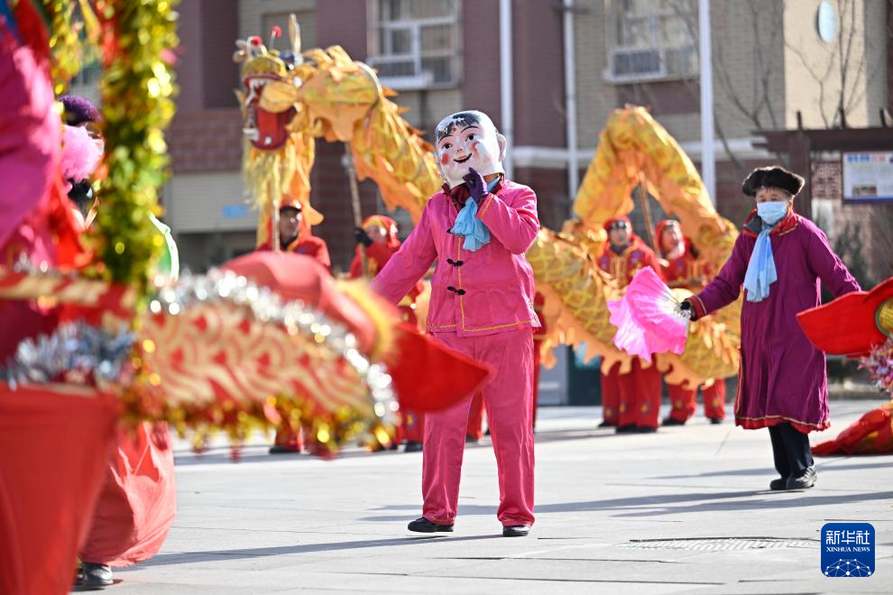 1月18日,银川市西夏区芦花洲社区居民在排练社火。