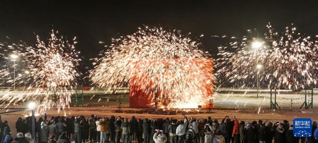 1月17日,游客在河北省遵化市团瓢庄镇山庄雪乡景区观看打铁花(无人机照片)。