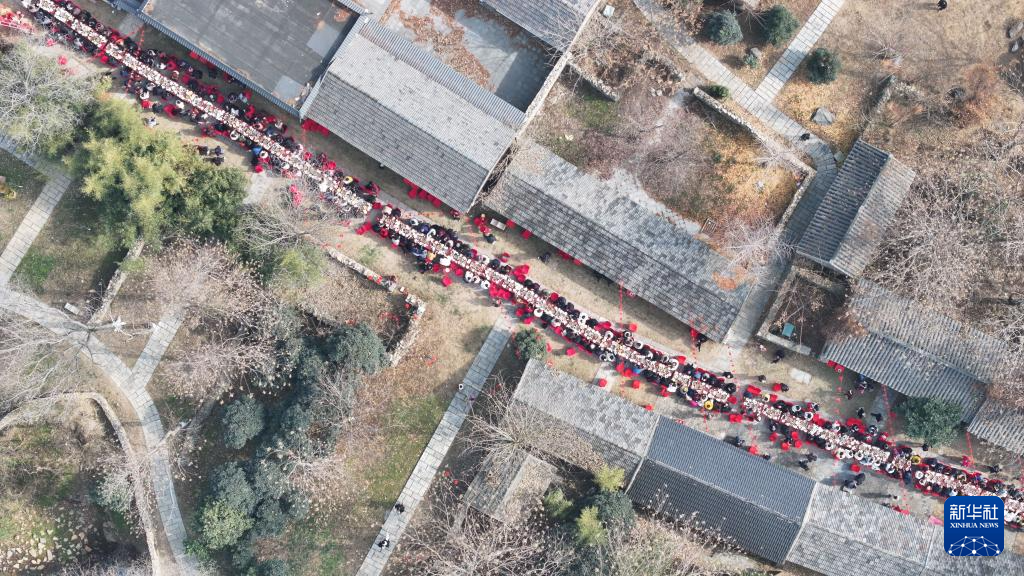 1月18日,在江苏省淮安市洪泽区老子山镇龟山村,村民与游客品尝长桌宴美食(无人机照片)。