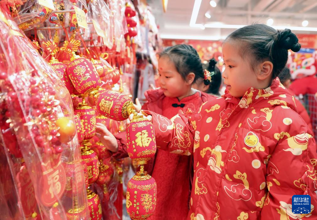 1月17日,小朋友在湖北省武汉市武昌区一家超市选购迎新春饰品。