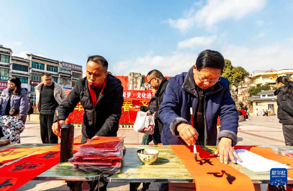 1月18日,书法爱好者在贵州省黔西市水西广场为市民写春联。