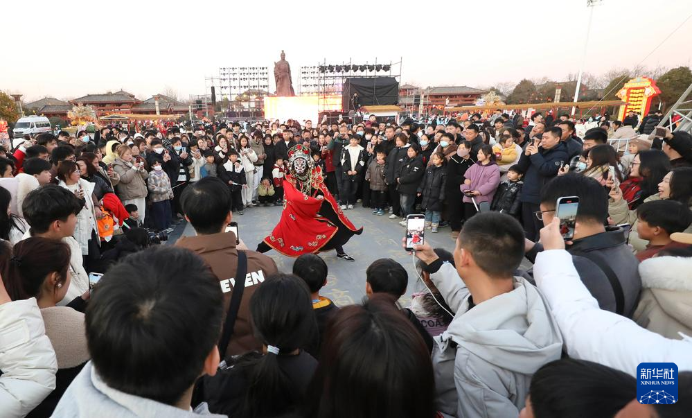 1月16日,民间艺人在河南省商丘市火神台景区为游客表演川剧变脸。