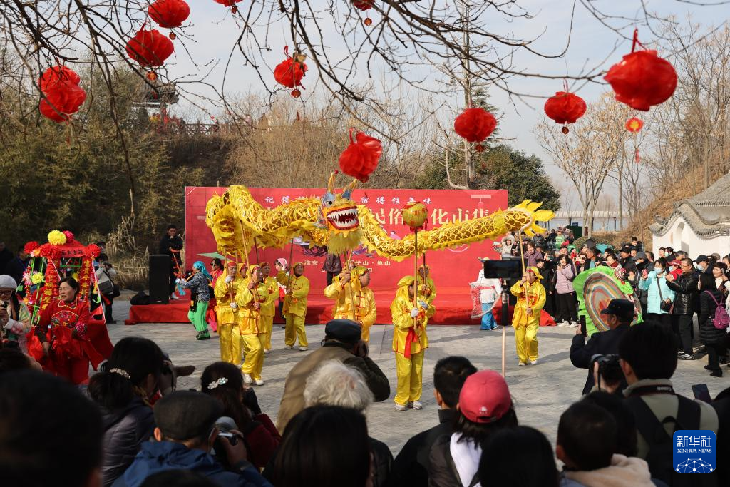 1月18日,在江苏省淮安市洪泽区老子山镇龟山村举办的民俗文化市集,游客在观看民俗节目表演。