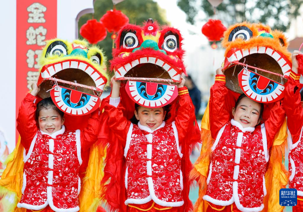 1月17日,在安徽省黄山市屯溪示范幼儿园,小朋友在体验民俗舞狮。