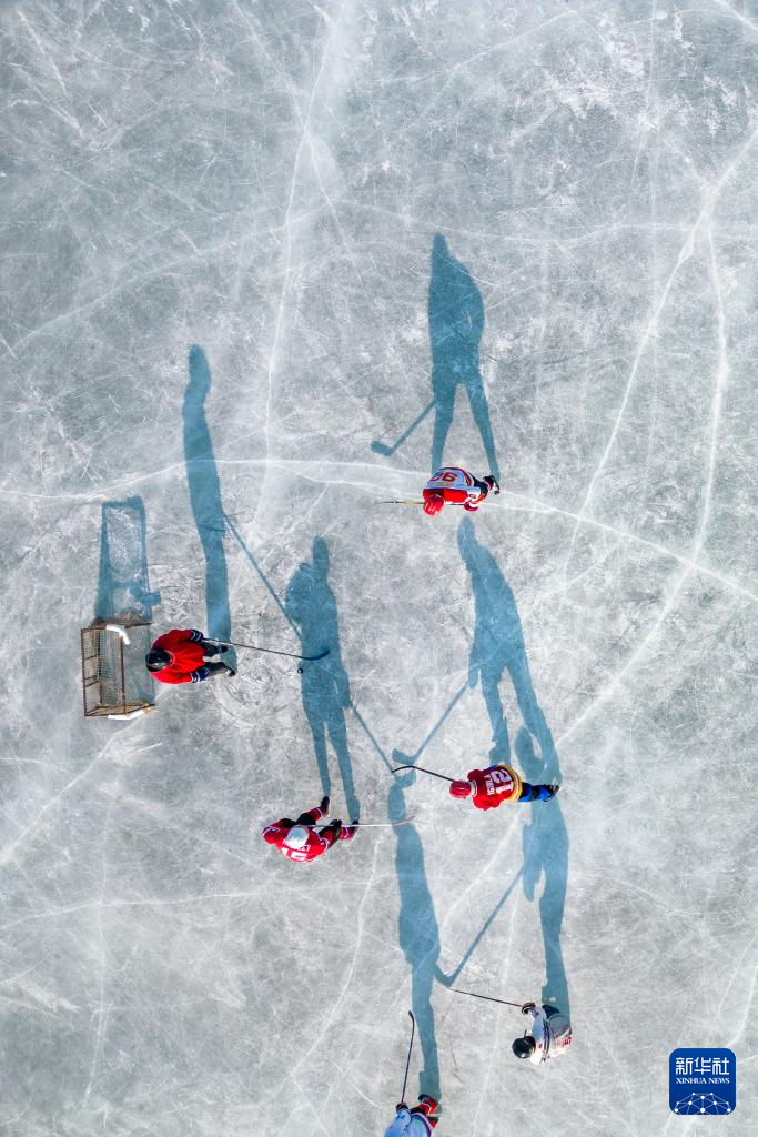 1月18日,人们在哈尔滨市丁香公园内打冰球(无人机照片)。