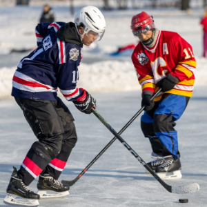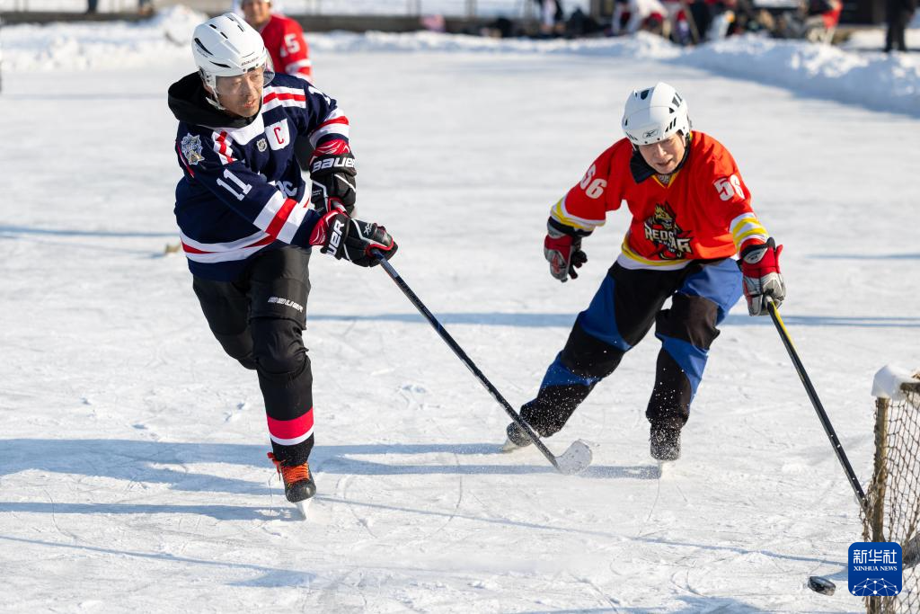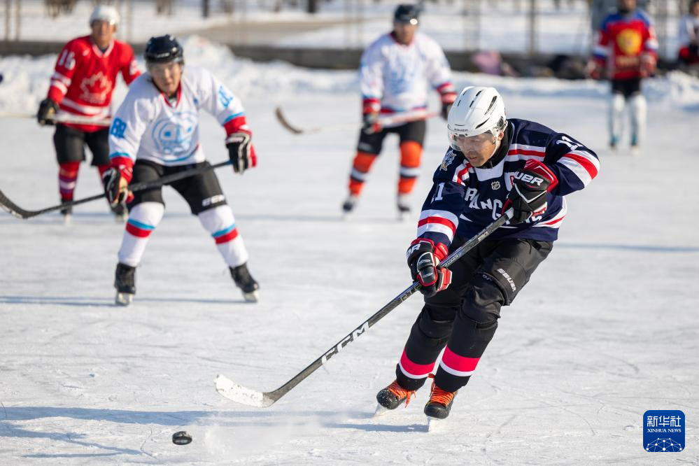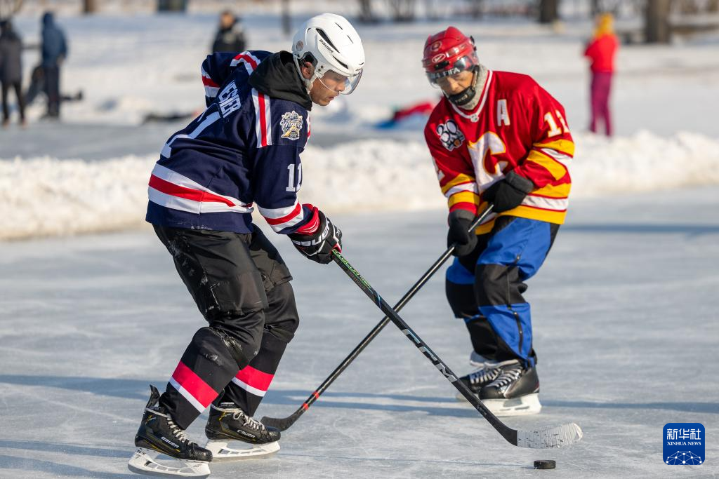 1月18日,人们在哈尔滨市丁香公园内打冰球。