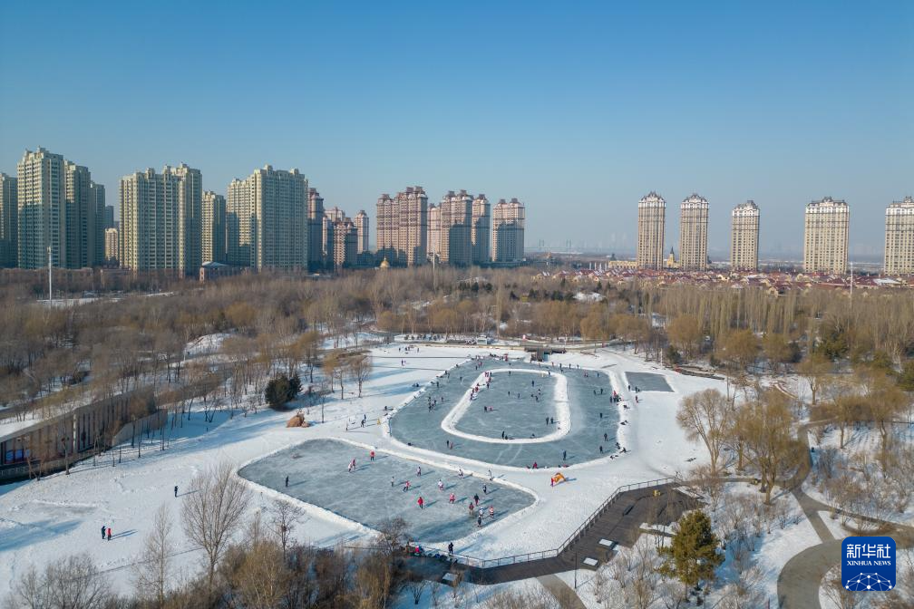 随着2025年第九届亚洲冬季运动会临近,人们在哈尔滨的室外冰场享受冰上运动的快乐。