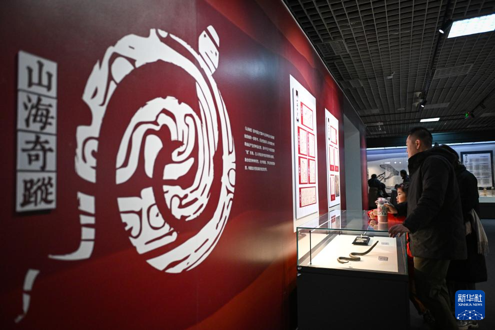 1月18日,观众在展览中观看介绍《山海经》中蛇形象的展板。