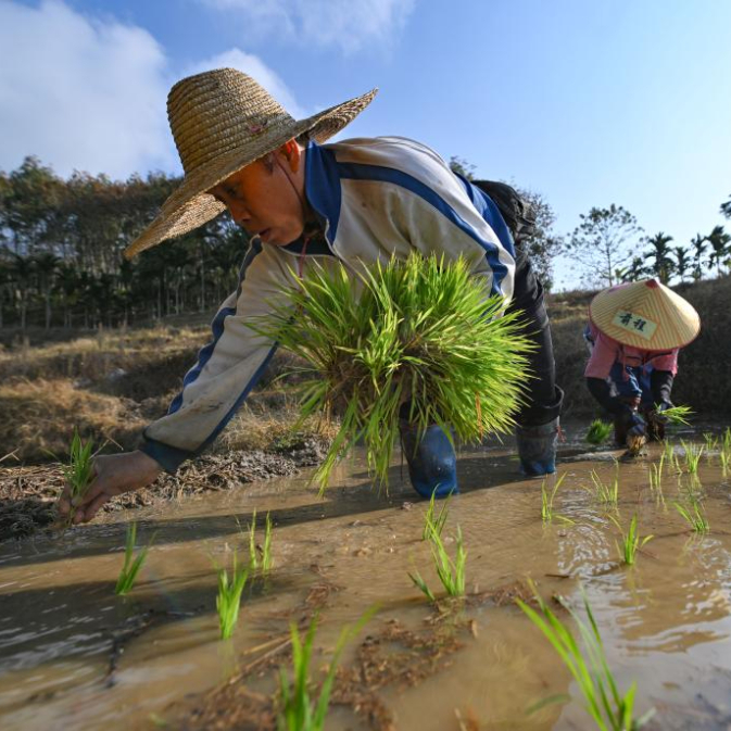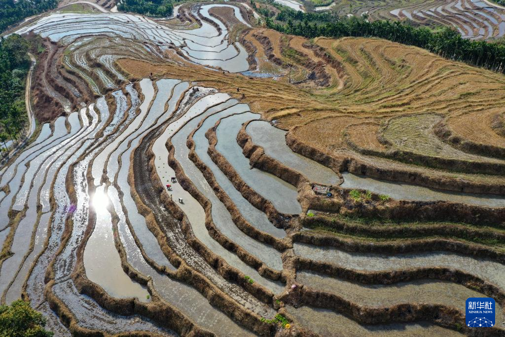 新春将至,海南省中部山区的五指山已进入春耕时节。在五指山市毛阳镇牙胡梯田,农民们辛勤劳作,田间一派农忙景象。