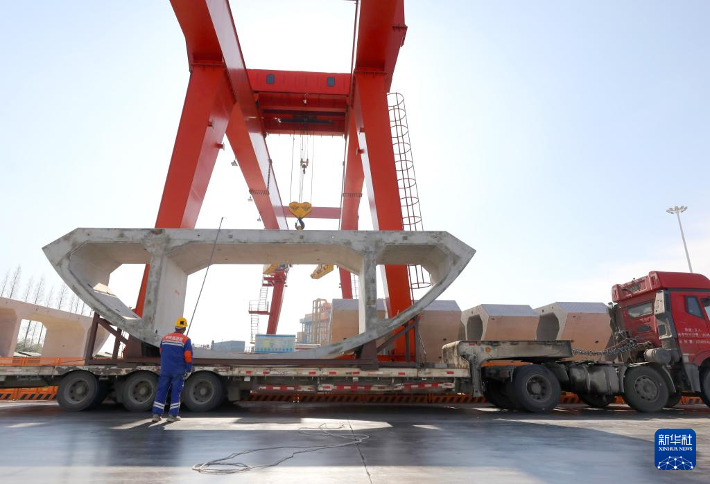 1月18日,一名工人在沪渝蓉高铁崇太长江隧道管片临时堆场辅助吊装弧形件。
