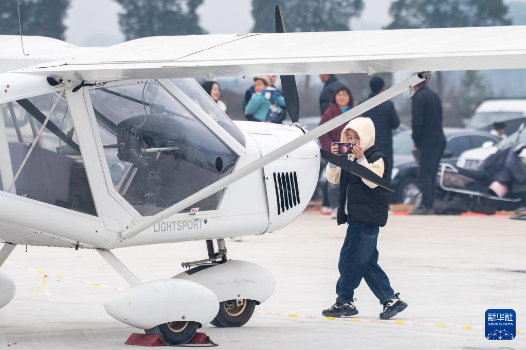 1月18日,在柳叶湖龙翔低空飞行营地,游客在拍摄展示的飞行器。