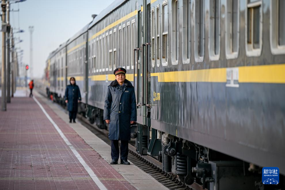 1月19日,乘务员在赛汗塔拉站等待乘客登车。