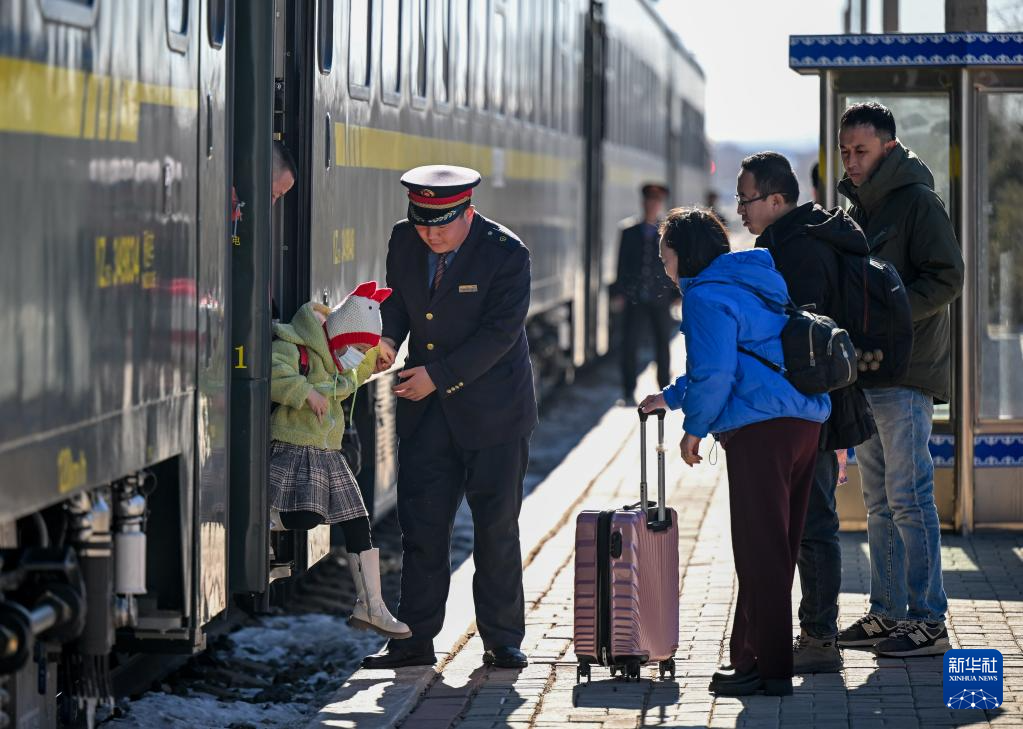 1月19日,在白音察干站,乘务员穆杰帮助小乘客下车。