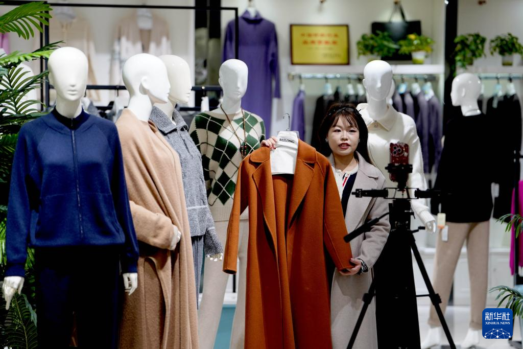 1月18日,河北省邢台市清河县一家羊绒制品销售门店的员工在直播平台上推介羊绒产品。