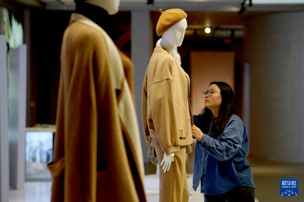 1月18日,河北省邢台市清河县一家羊绒制品生产企业的员工在展厅内整理羊绒外套。