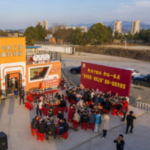 1月20日,在建德市更楼街道司机之家爱心驿站,货车司机和家属参加温暖年夜饭系列活动(无人机照片)。