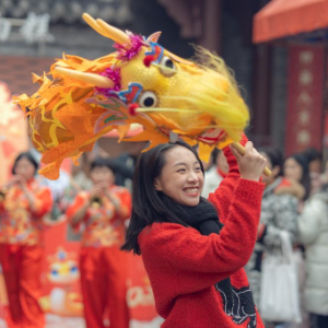 1月21日,游客在重庆市巴南区西流沱小镇体验非遗项目姜家舞龙。
