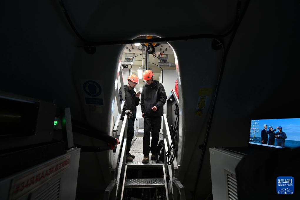 1月19日,运维人员在机舱内讨论风机故障处理方法。