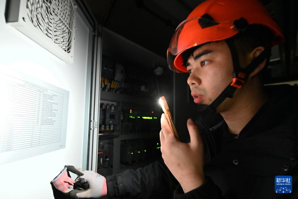 1月19日,运维人员在风机机舱内查看液压系统电源图。