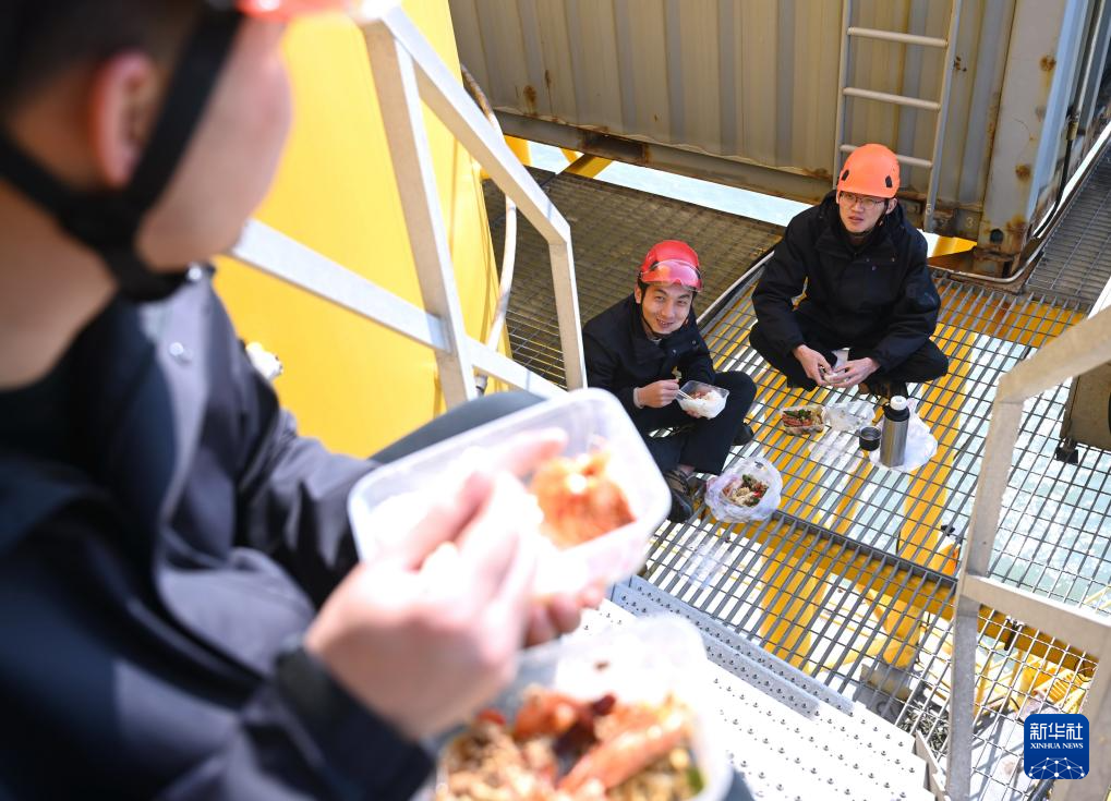 1月19日,运维人员在海上风电塔基上吃着从岸上带来的午餐。