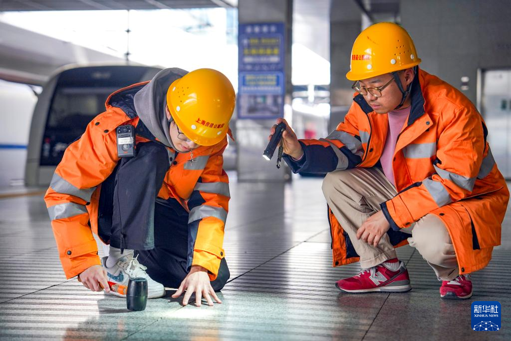 1月22日,房建巡检工潘梓翊(左)和武牡飞在上海火车站检查站台大理石是否空鼓。